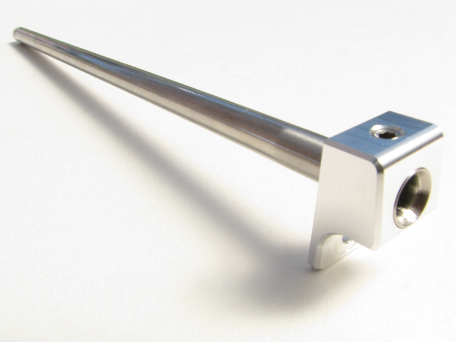 This is my new an improved throttle tube, now with billet 6061 end and stainless steel tube. It comes with instructions, mounting hardware, and Teflon bushing. It is designed to be used with linkages that line up with the stock cable hole, not for use with cross bar linkages. Made in the USA